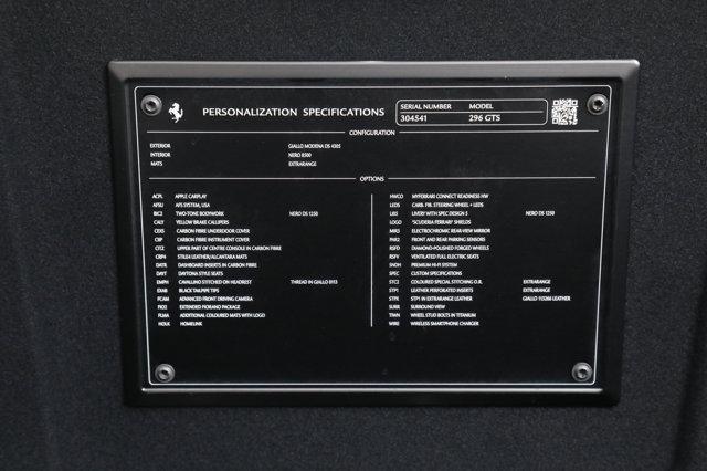 Ferrari 296 GTS Assetto Fiorano- FERRARI CERTIFIED PRE-OWNED - AVAILABLE EXTENDED FERRARI WARRANTY -- Giallo Modena over Nero - One Owner - Very Low Miles - Pristine Condition - Many Fine Options - Sold as New by Our Dealership - Expertly Maintained by Our Factory Trained Technicians - Ferrari Factory Warranty to 6/1/27 - Complimentary Ferrari Genuine Maintenance Service to 6/1/31 -Factory Options:- Two-Tone Bodywork- Livery with Special Design 5 in Nero- Fiorano Package- Carbon Fiber Underdoor Covers- Carbon Fiber LED Steering Wheel- Carbon Fiber Dashboard Inserts- Carbon Fiber Instrument Cover- Carbon Fiber Upper Center Console- Diamond Forged Wheels- Wheel Bolts in Titanium- Yellow Brake Calipers- Scuderia Ferrari Shields- Ventilated Full Electric Seats- Daytona Style Seats- Leather Perforated Seat Inserts in Giallo- Cavallino Stitched to Headrests in Giallo- Special Stitching in Giallo- Premium HiFi Sound System- Apple CarPlay- Wireless Smartphone Charger- Black Tailpipe Tips- Surround View- Advanced Front Driving Camera- Advanced Frontlight System (AFS)- Alcantara and Leather Floor Mats- Embroidered Mats with Logo- HomeLink- Electrochromic Rearview Mirror- Front and Rear Parking SensorsIf you are in the market for a Ferrari 296 GTS, please call or email us today.This Ferrari has passed a multi-point inspection performed by our factory trained technicians, and has been enrolled in the Ferrari Approved Certified Pre-Owned Program. The Certified program makes available up to two years of additional Ferrari Power Approved Warranty coverage. Please see dealer for more details.