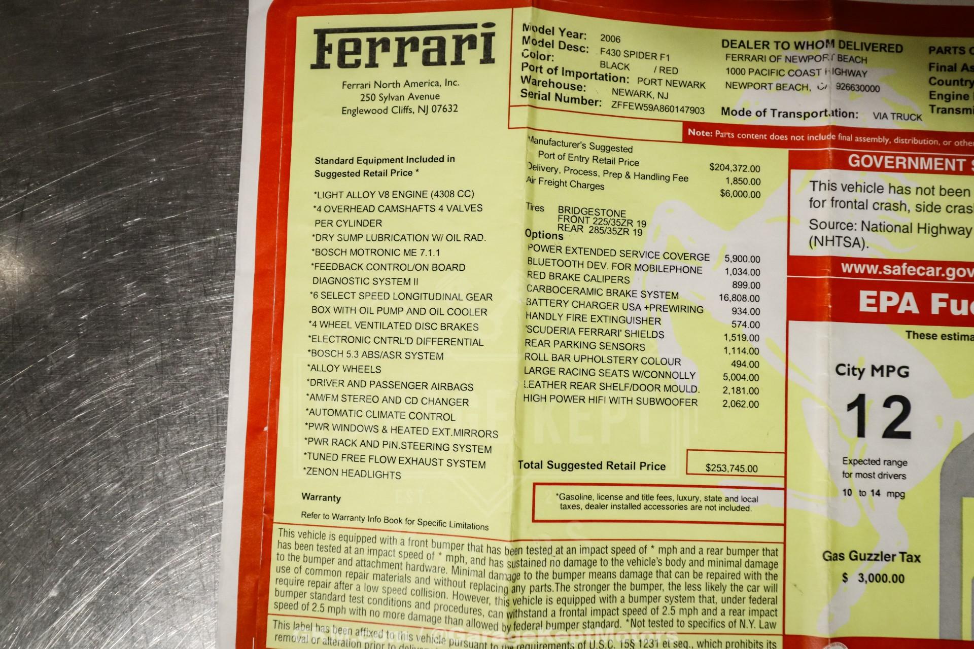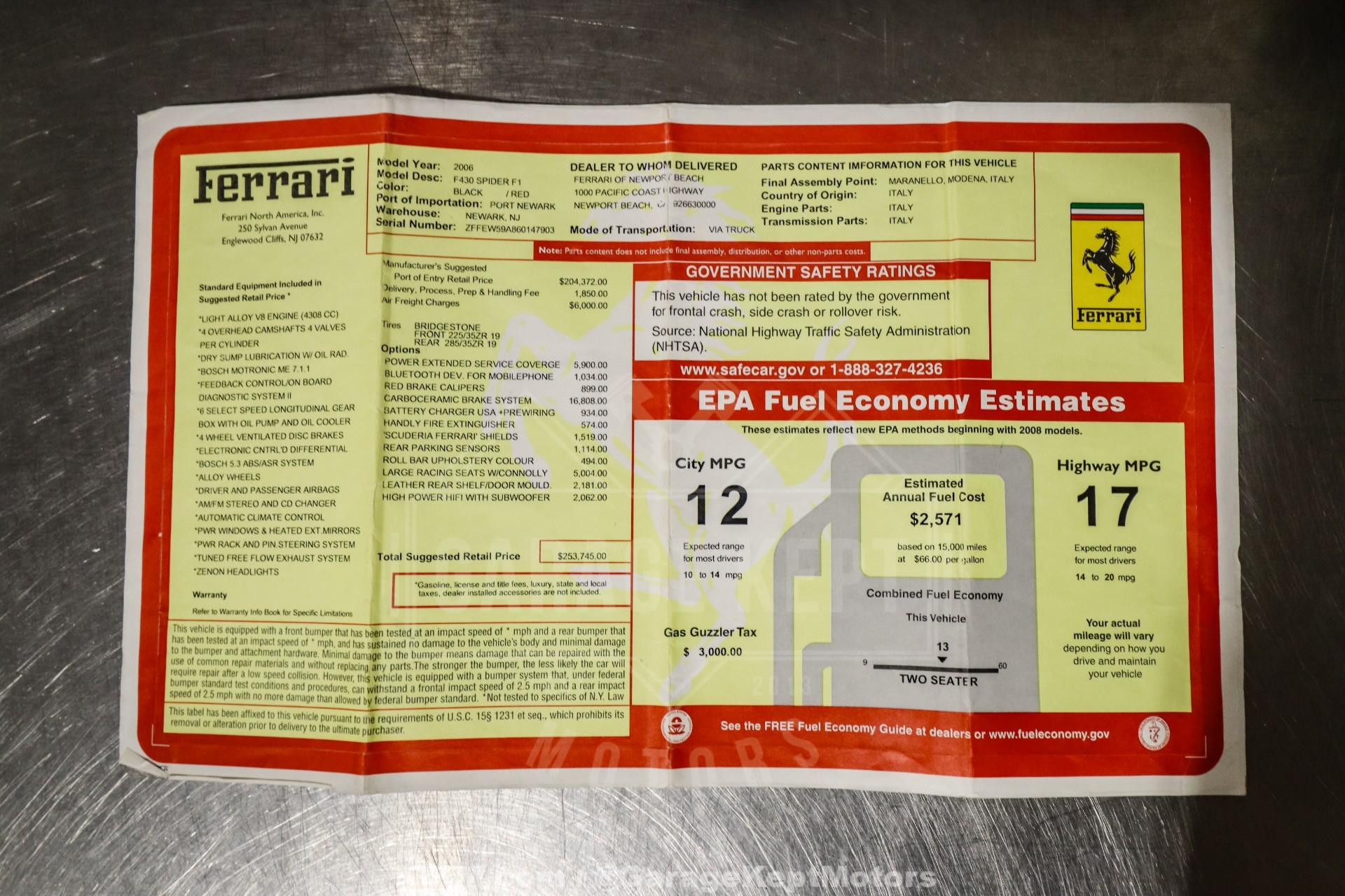 2006 Ferrari F430 Spider2-Door Convertible - Gated 6 Speed Manual Conversion- 4.3L Rear Engine V8 with RWD- Nero Black over Red Leather Interior- Carbon Ceramic Brakes with Red Calipers- Scuderia Ferrari Shields- Carbon Fiber Racing Seats- Leather Rear Shelf and Door Mould- Carbon Fiber Interior Trim- Handly Fire Extinguisher- Original Window Sticker- February 2026 Manual Conversion- February 2026 Service: Oil and Filter, Air Filter, Engine Mounts- Purchased New in California- Clean CarFax- 12k Original MilesThe 2006 Ferrari F430 Spider represents the perfect balance of modern performance and analog engagement, and this example stands out with its highly sought-after gated 6-speed manual conversion completed in February 2026. Originally purchased new in California and showing just 12,259 original miles, this Spider offers exceptional provenance along with a clean CarFax and its original window sticker. Finished in timeless Nero Black over red leather, it embodies the classic Ferrari color combination that never goes out of style.At its heart is a naturally aspirated 4.3-liter rear-mounted V8, delivering thrilling performance through the rear wheels. Known for its razor-sharp throttle response and spine-tingling exhaust note, the F430's V8 becomes even more engaging when paired with a traditional open-gate 6-speed manual transmission. The recent February 2026 serviceincluding oil and filter, air filter, and engine mounts, ensures the car is freshly sorted and ready to be enjoyed as intended.Visually, this Spider makes an immediate impression. The deep Nero exterior is accented by Scuderia Ferrari shields on the fenders and striking red brake calipers clamping down on carbon ceramic brakes. The combination not only enhances performance but also adds to the car's unmistakable presence. With the top lowered, the F430 Spider delivers a pure open-air driving experience, allowing the sound of the V8 to fully command attention.The interior is equally purposeful and refined. Carbon fiber racing seats anchor the cockpit, offering exceptional support while reinforcing the car's motorsport DNA. Carbon fiber trim throughout the cabin adds a technical, performance-focused aesthetic, complemented by a leather rear shelf and leather-wrapped door moldings for a touch of luxury. A neatly mounted fire extinguisher serves as a nod to Ferrari's racing heritage and completes the driver-centric environment.With its low mileage, documented California origins, rare gated manual conversion, and recent comprehensive service, this 2006 Ferrari F430 Spider presents a unique opportunity for collectors and enthusiasts alike. It delivers the visceral, mechanical connection that defines the best Ferraris, an open-top Italian supercar that feels as special to drive as it does to admire.