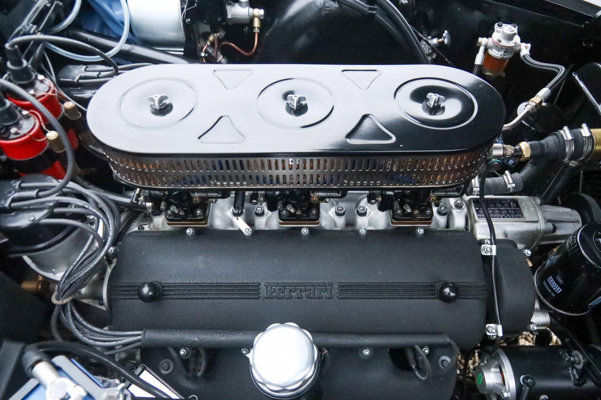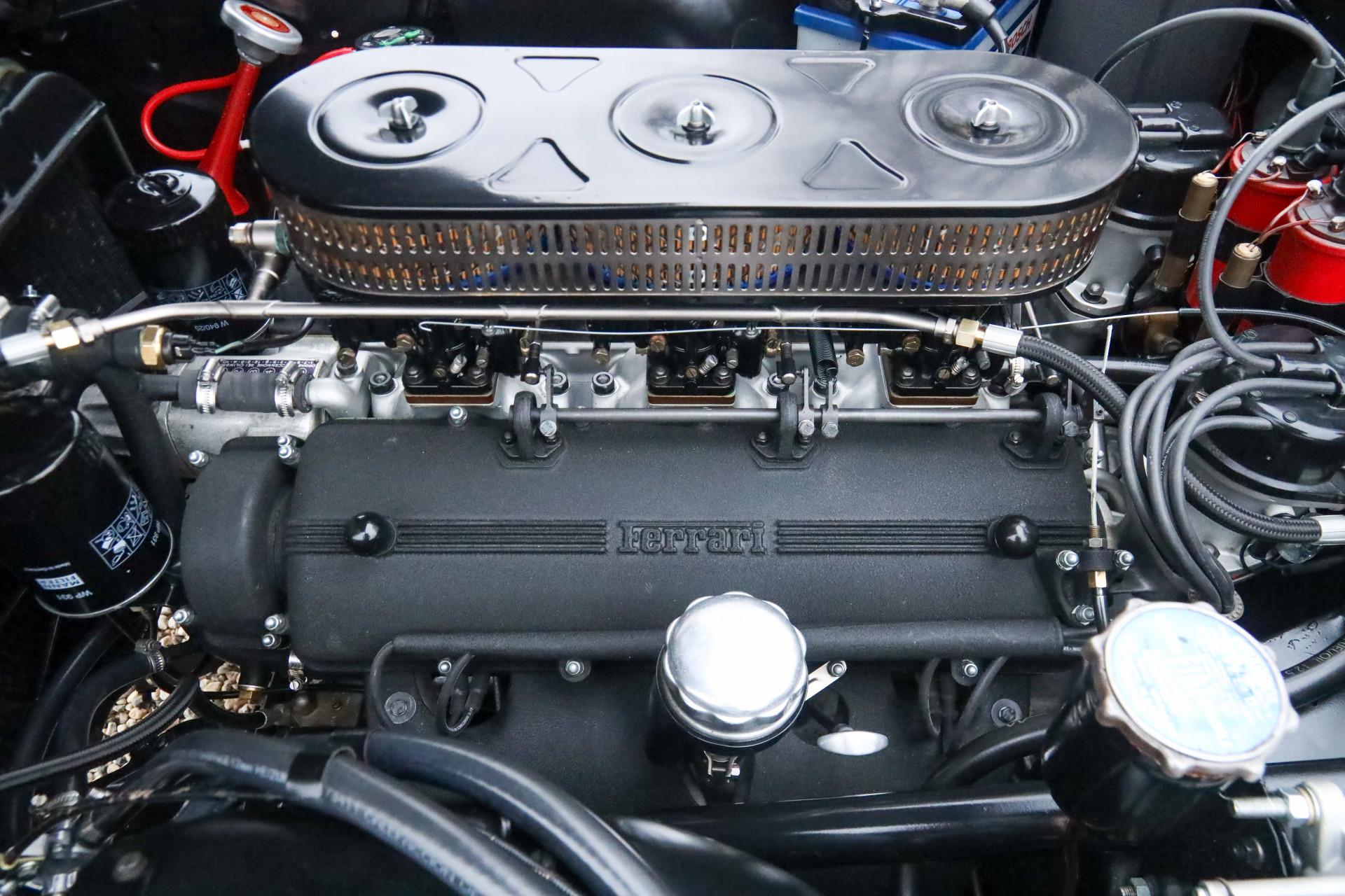 Beneath the long hood lies the well known 3.0 liter Colombo V12, designed by Gioacchino Colombo. This lightweight twelve cylinder engine formed the technical backbone of many Ferrari models from this era. In the 250 GTE it produces approximately 240 horsepower and is renowned for its smooth character and distinctive sound. The model designation 250 refers to the displacement per cylinder, a naming tradition Ferrari frequently applied at the time.