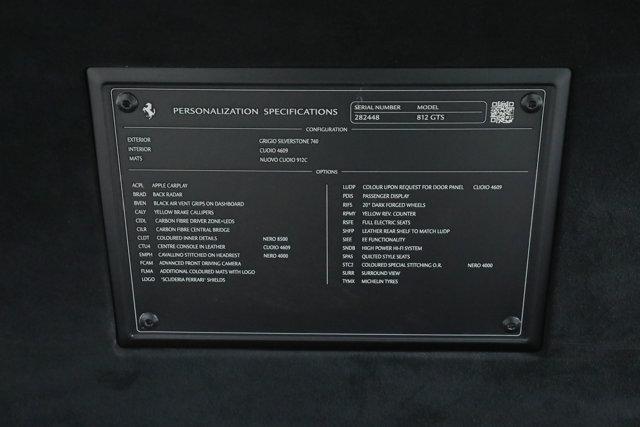 Ferrari 812 GTS- FERRARI CERTIFIED PRE-OWNED - AVAILABLE EXTENDED FERRARI WARRANTY -- Grigio Silverstone over Cuoio - ONE OWNER - Low Miles - Pristine Condition - Many Fine Options - Expertly Maintained by Authorized Ferrari Dealers - Available Extended Ferrari Warranty - Complimentary Ferrari Genuine Maintenance Service to 12/7/29 -Factory Options:- Carbon Fiber Driver Zone with LED Steering Wheel- Carbon Fiber Central Bridge- 20-inch Dark Forged Wheels- Yellow Brake Calipers- Scuderia Ferrari Shields- Full Electric Seats- Quilted Style Seats- Cavallino Stitched to Headrests in Nero- Special Stitching in Nero- Colored Inner Details in Nero- Leather Center Console in Cuoio- Leather Door Panels in Cuoio- Leather Rear Shelf in Cuoio- Carpets in Nuovo Cuoio- Passenger Display- High Power HiFi Sound System- Apple CarPlay- Surround View- Advanced Front Driving Camera- Rear Radar- Black Air Vent Grips on Dashboard- Yellow Rev Counter- Embroidered Mats with LogoIf you are in the market for a Ferrari 812 GTS, please call or email us today.This Ferrari has passed a multi-point inspection performed by our factory trained technicians, and has been enrolled in the Ferrari Approved Certified Pre-Owned Program. The Certified program makes available up to two years of additional Ferrari Power Approved Warranty coverage. Please see dealer for more details.