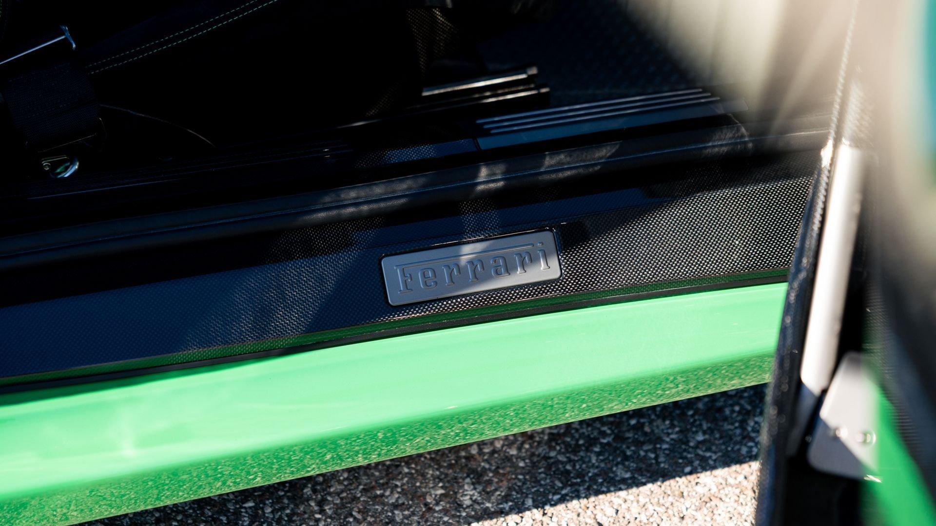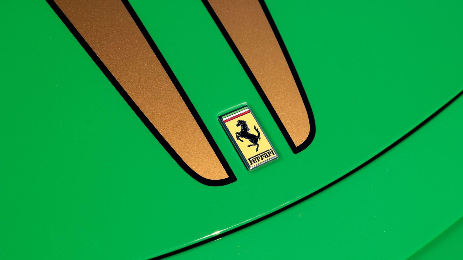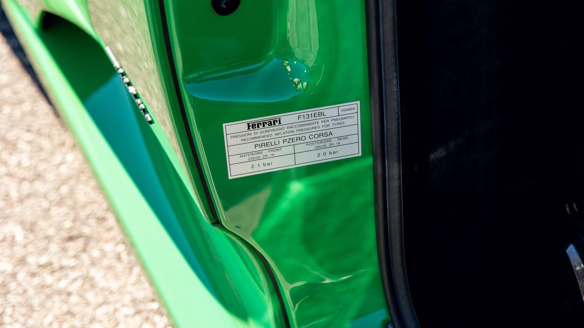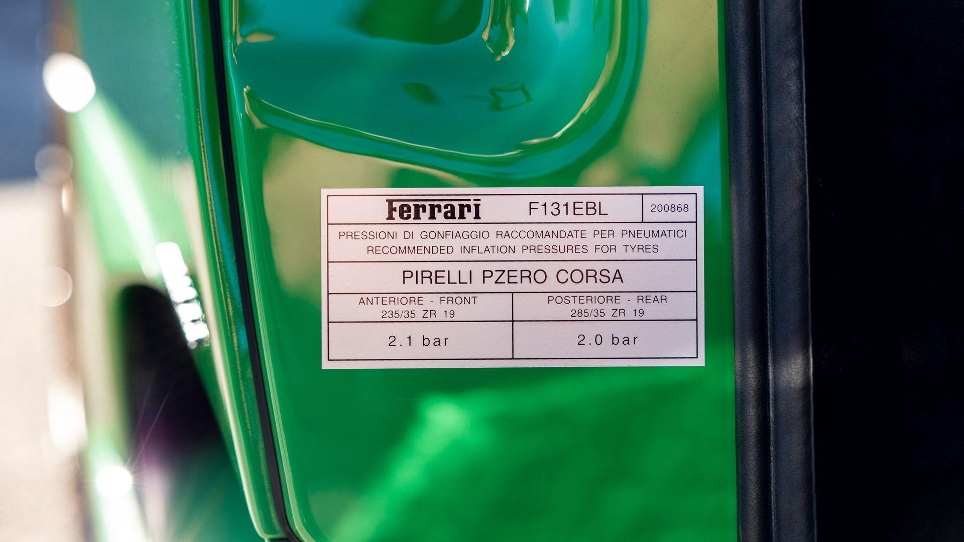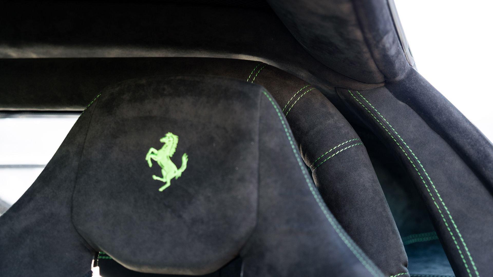 This stunning 430 Scuderia was ordered new through Ferrari dealer Lumani Krüger in Germany, with its original November 2007 order form specifying the car in Porsche Grün over Tessuto Nero. It is thought to be the only example of its type finished in this shade, specified by its paint sticker as Verde PPG (159331), supplied by PPG Industries. The vibrant paint was paired with equally striking Gold racing stripes running the length of the car and Gold-finished 19-inch alloy wheels for one of the most striking Scuderia specifications imaginable. The invoice also records a lavishly equipped example from new, including four-point harnesses, a rollover bar, carbon-fiber front and rear elements, carbon entry sills, a carbon LED steering wheel, an Alcantara-trimmed steering wheel and handbrake lever, Verde deviated stitching throughout, a satellite alarm, and a silver dedication plaque, inscribed “Raja & Andy.” In total, the car was ordered with over €41.000 in options-a considerable sum for the period, when the palette of personalization choices was far narrower than it is today.