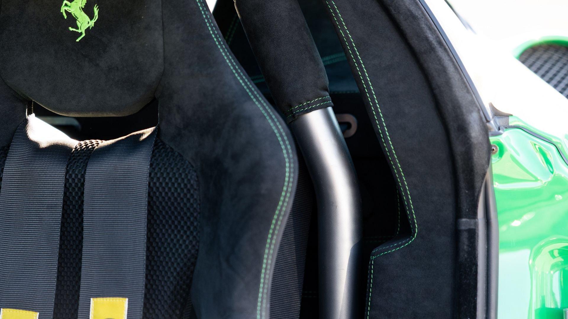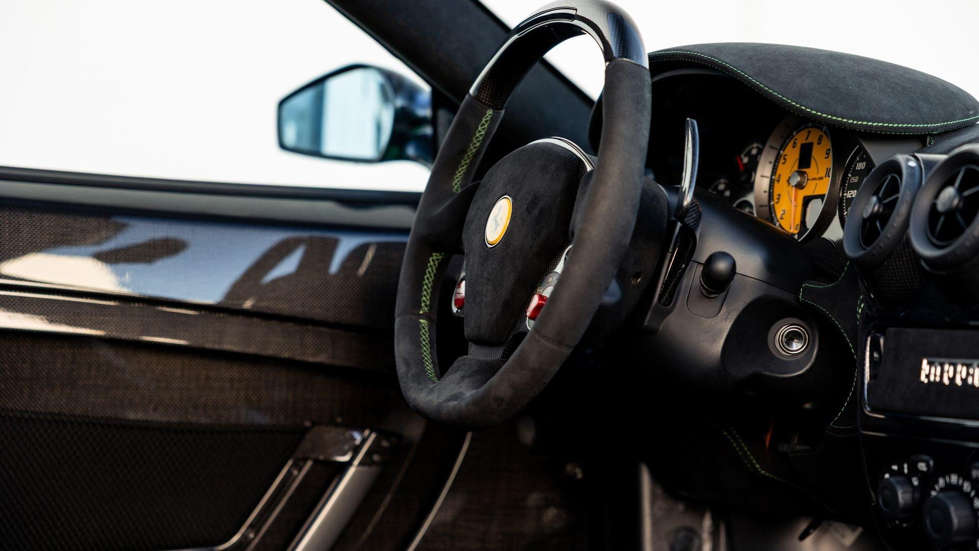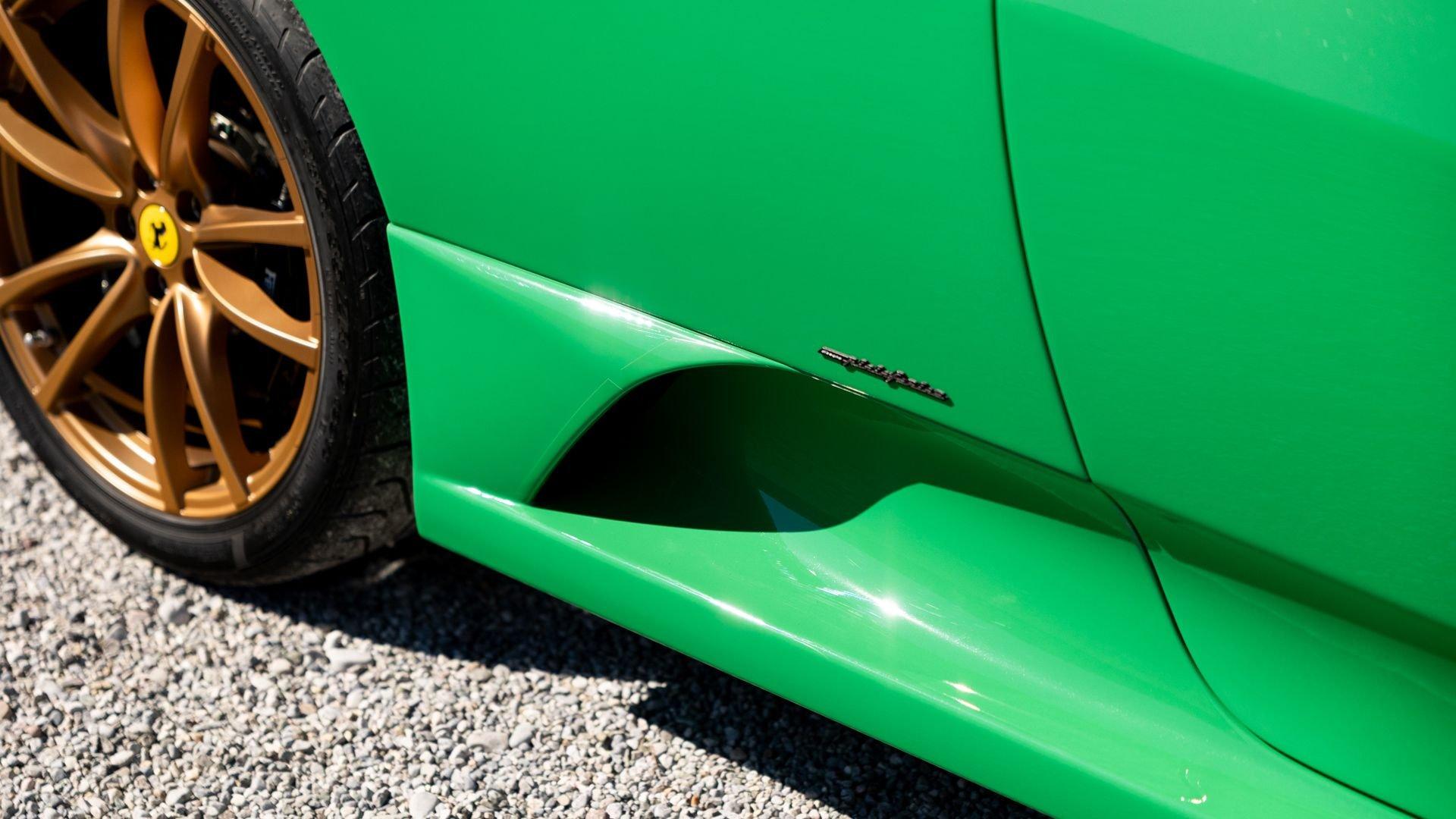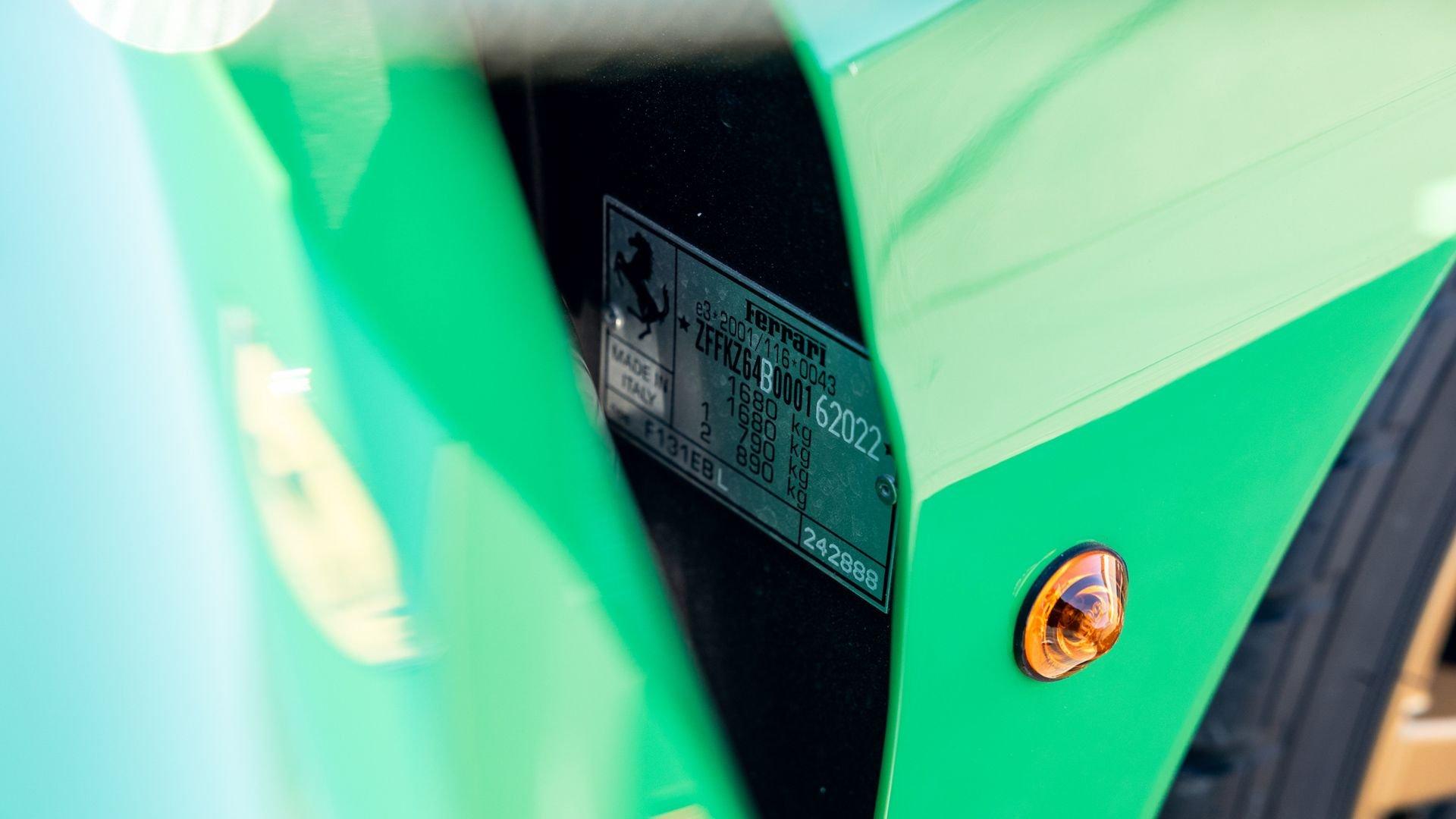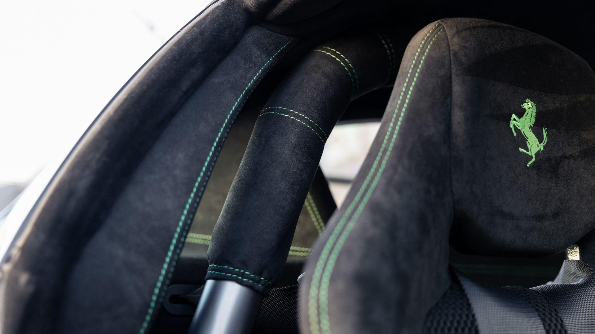 This stunning 430 Scuderia was ordered new through Ferrari dealer Lumani Krüger in Germany, with its original November 2007 order form specifying the car in Porsche Grün over Tessuto Nero. It is thought to be the only example of its type finished in this shade, specified by its paint sticker as Verde PPG (159331), supplied by PPG Industries. The vibrant paint was paired with equally striking Gold racing stripes running the length of the car and Gold-finished 19-inch alloy wheels for one of the most striking Scuderia specifications imaginable. The invoice also records a lavishly equipped example from new, including four-point harnesses, a rollover bar, carbon-fiber front and rear elements, carbon entry sills, a carbon LED steering wheel, an Alcantara-trimmed steering wheel and handbrake lever, Verde deviated stitching throughout, a satellite alarm, and a silver dedication plaque, inscribed “Raja & Andy.” In total, the car was ordered with over €41.000 in options-a considerable sum for the period, when the palette of personalization choices was far narrower than it is today.