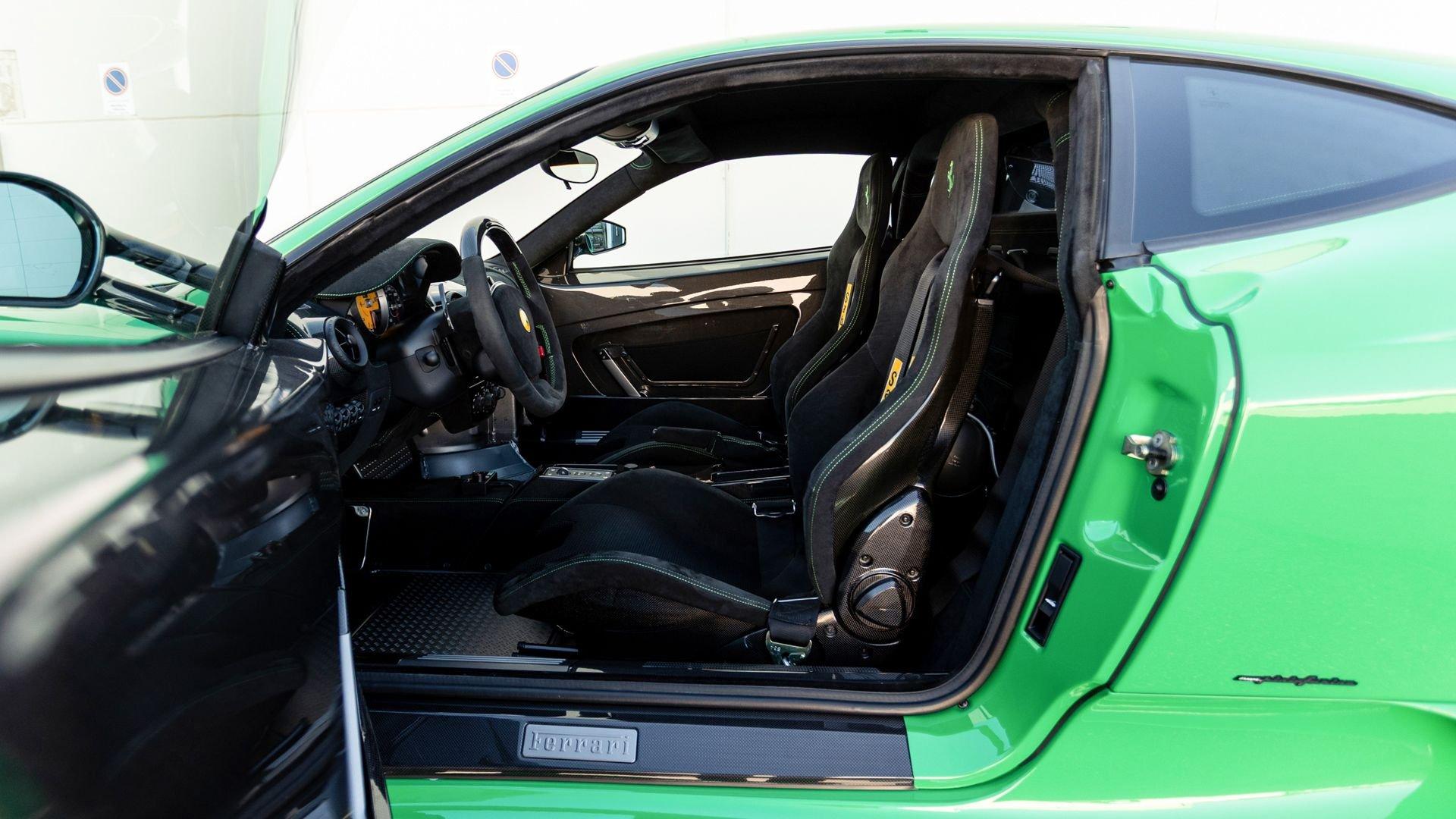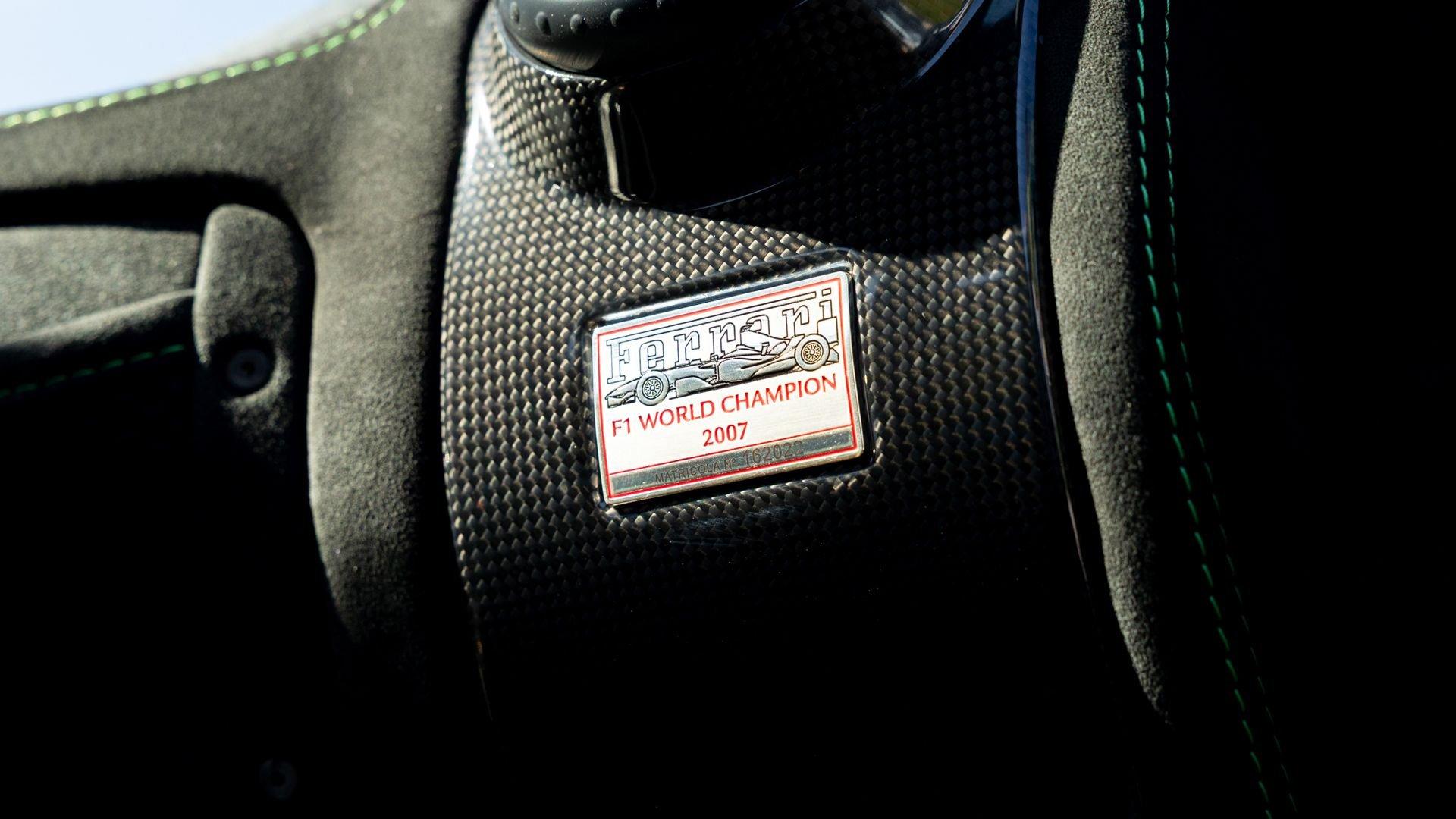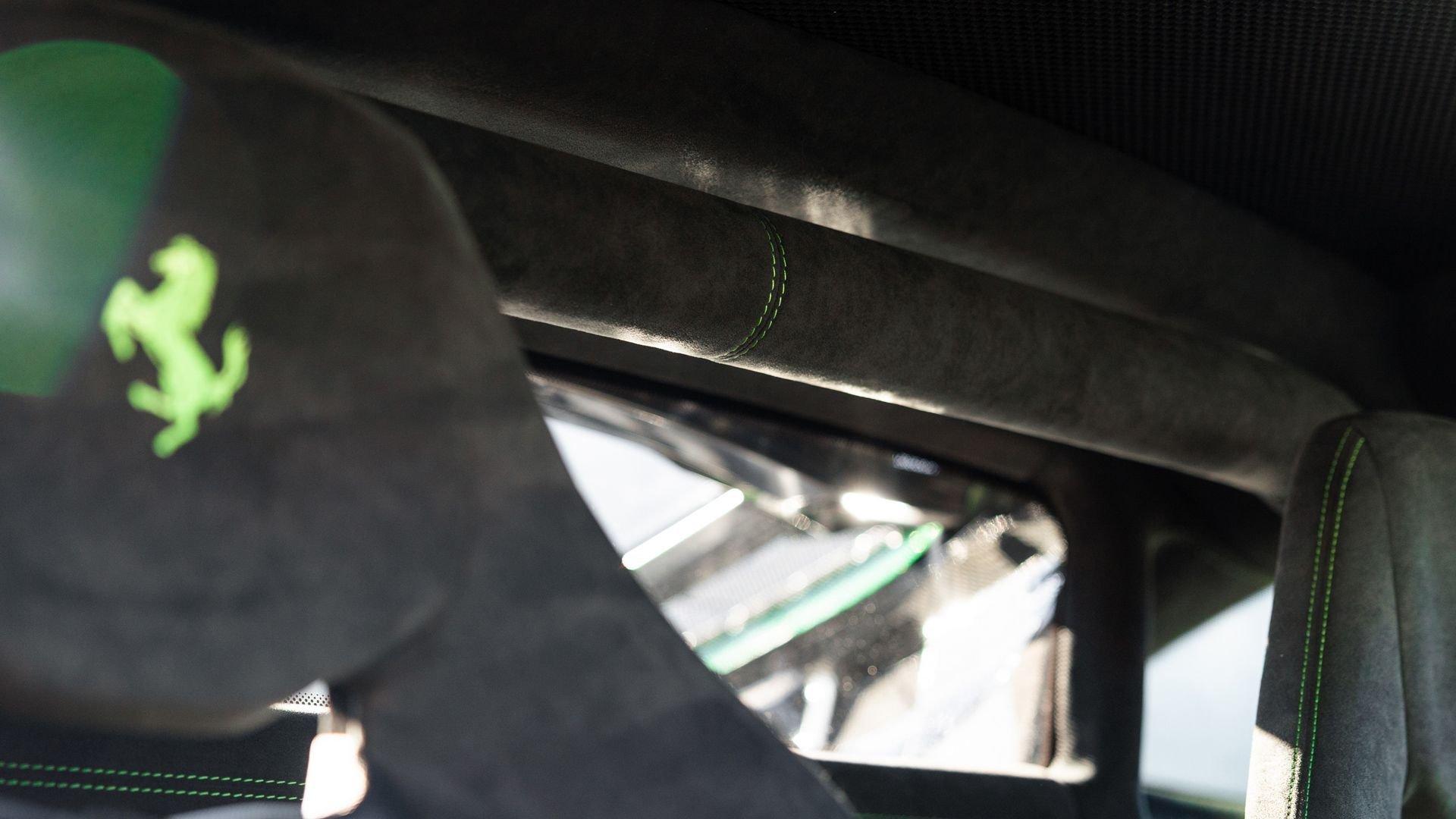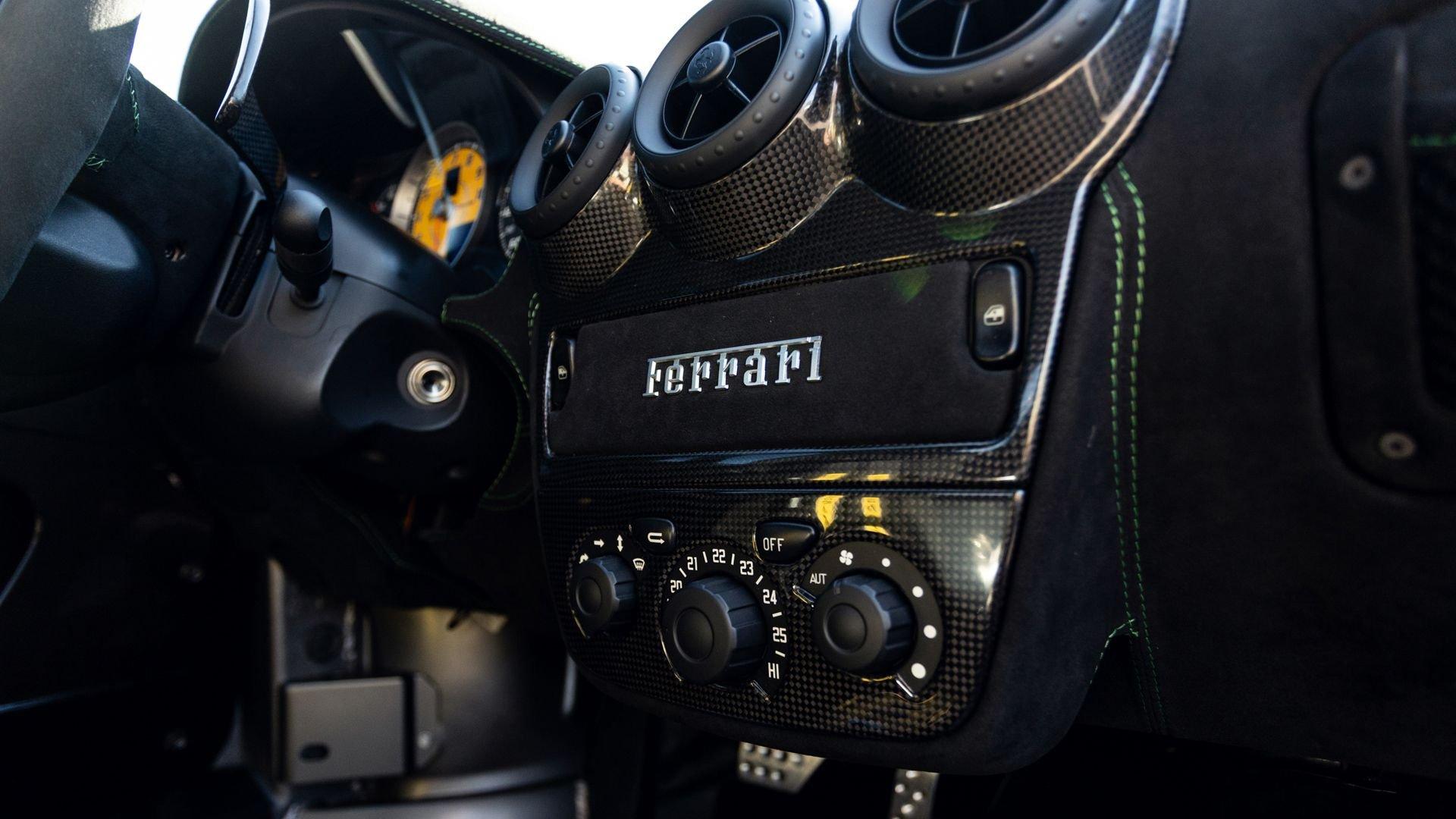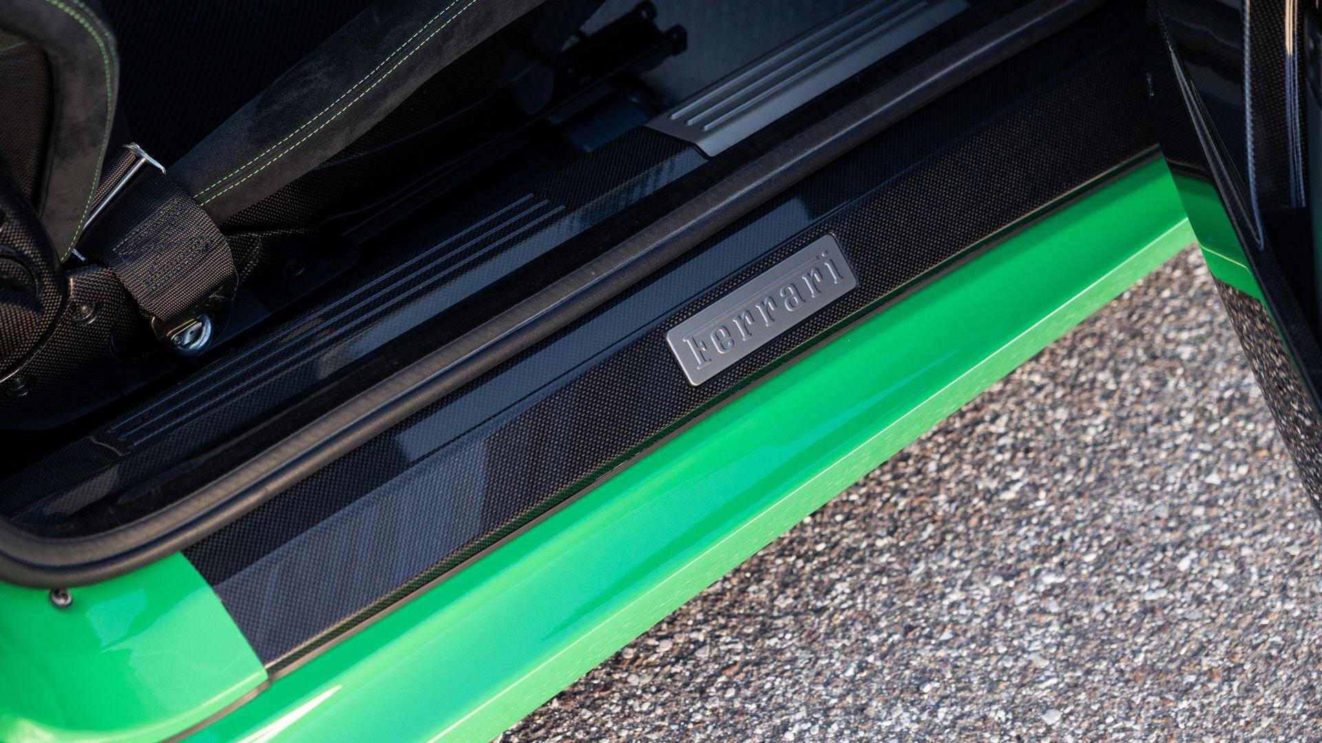 This stunning 430 Scuderia was ordered new through Ferrari dealer Lumani Krüger in Germany, with its original November 2007 order form specifying the car in Porsche Grün over Tessuto Nero. It is thought to be the only example of its type finished in this shade, specified by its paint sticker as Verde PPG (159331), supplied by PPG Industries. The vibrant paint was paired with equally striking Gold racing stripes running the length of the car and Gold-finished 19-inch alloy wheels for one of the most striking Scuderia specifications imaginable. The invoice also records a lavishly equipped example from new, including four-point harnesses, a rollover bar, carbon-fiber front and rear elements, carbon entry sills, a carbon LED steering wheel, an Alcantara-trimmed steering wheel and handbrake lever, Verde deviated stitching throughout, a satellite alarm, and a silver dedication plaque, inscribed “Raja & Andy.” In total, the car was ordered with over €41.000 in options-a considerable sum for the period, when the palette of personalization choices was far narrower than it is today.