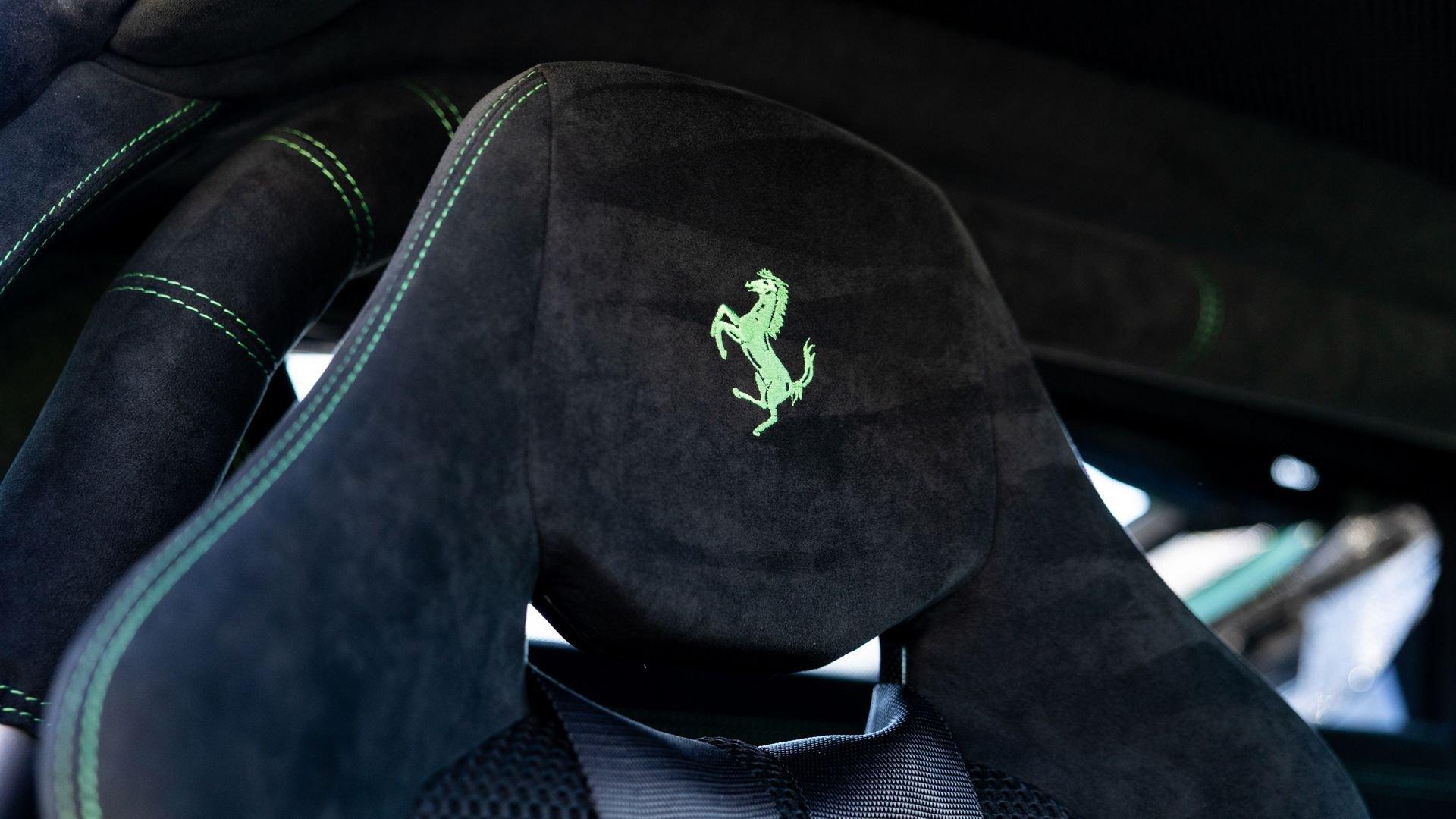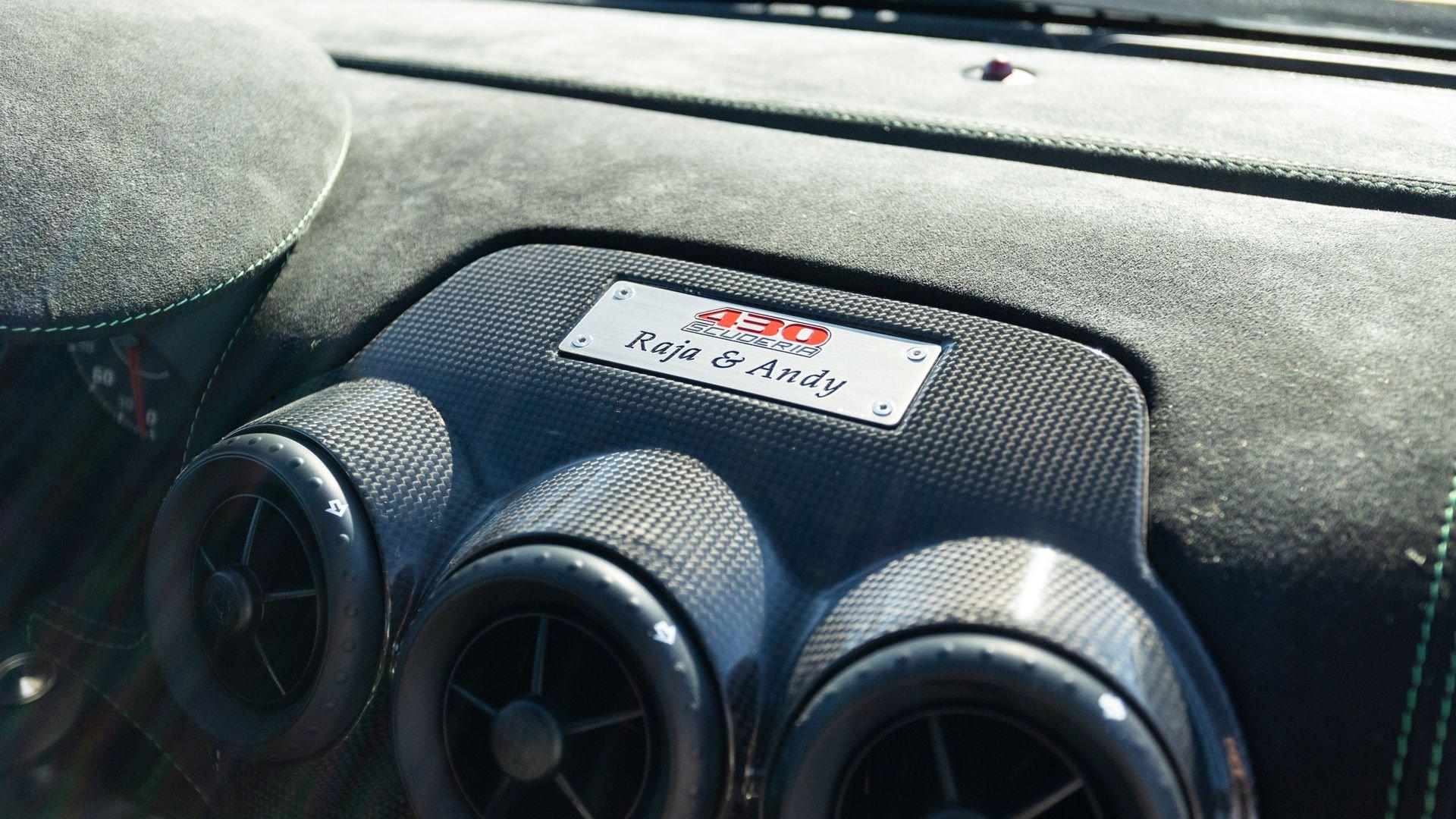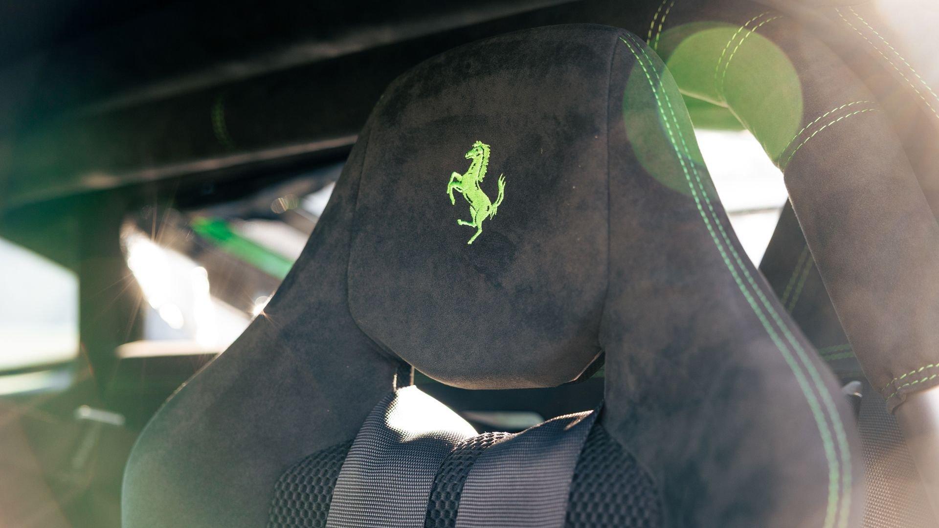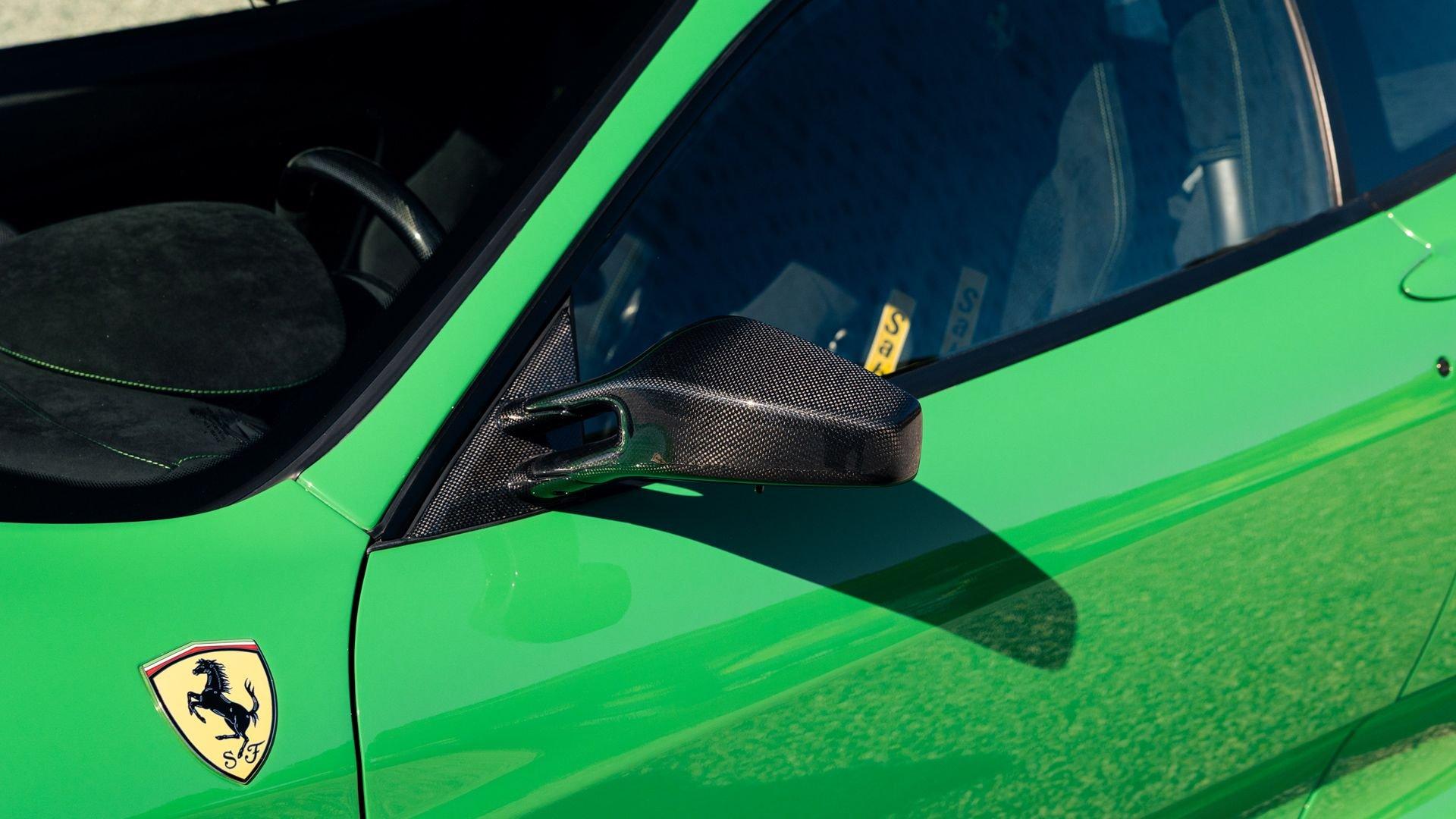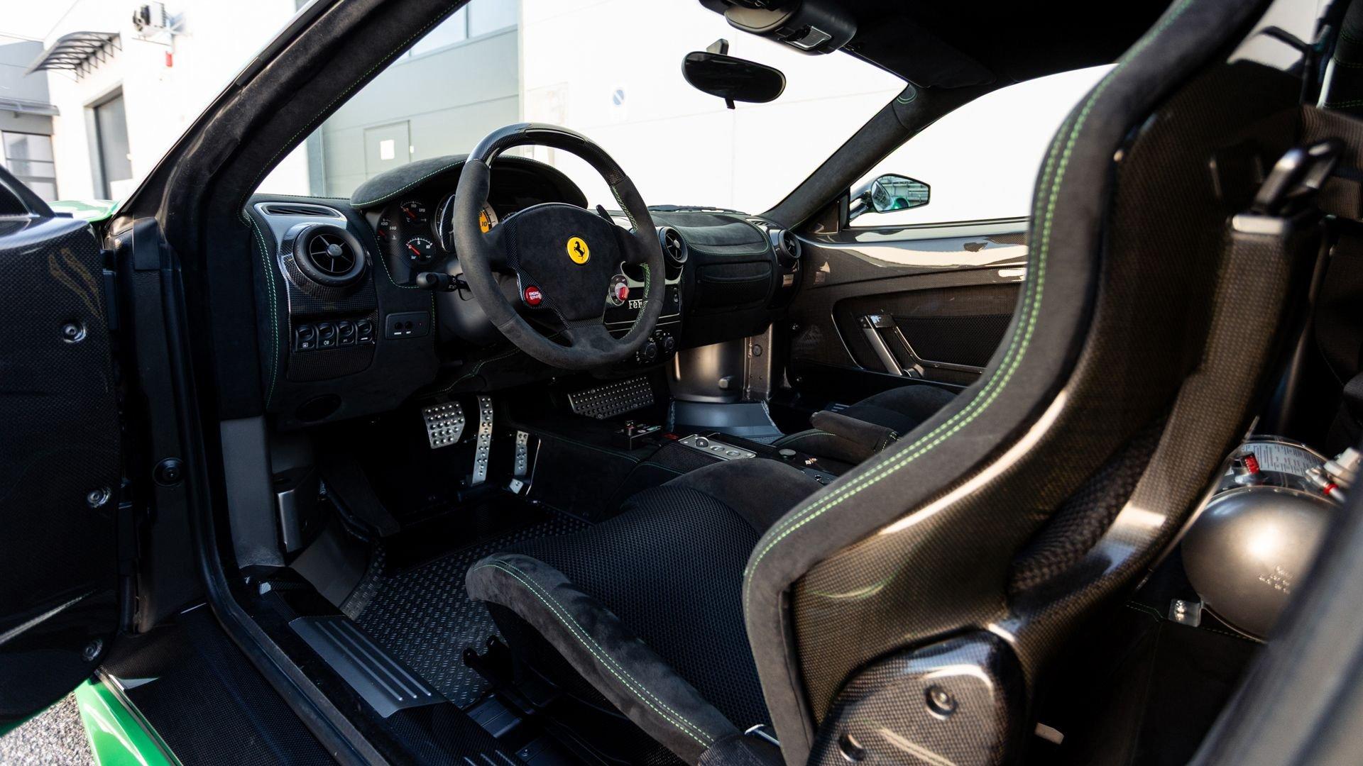 This stunning 430 Scuderia was ordered new through Ferrari dealer Lumani Krüger in Germany, with its original November 2007 order form specifying the car in Porsche Grün over Tessuto Nero. It is thought to be the only example of its type finished in this shade, specified by its paint sticker as Verde PPG (159331), supplied by PPG Industries. The vibrant paint was paired with equally striking Gold racing stripes running the length of the car and Gold-finished 19-inch alloy wheels for one of the most striking Scuderia specifications imaginable. The invoice also records a lavishly equipped example from new, including four-point harnesses, a rollover bar, carbon-fiber front and rear elements, carbon entry sills, a carbon LED steering wheel, an Alcantara-trimmed steering wheel and handbrake lever, Verde deviated stitching throughout, a satellite alarm, and a silver dedication plaque, inscribed “Raja & Andy.” In total, the car was ordered with over €41.000 in options-a considerable sum for the period, when the palette of personalization choices was far narrower than it is today.