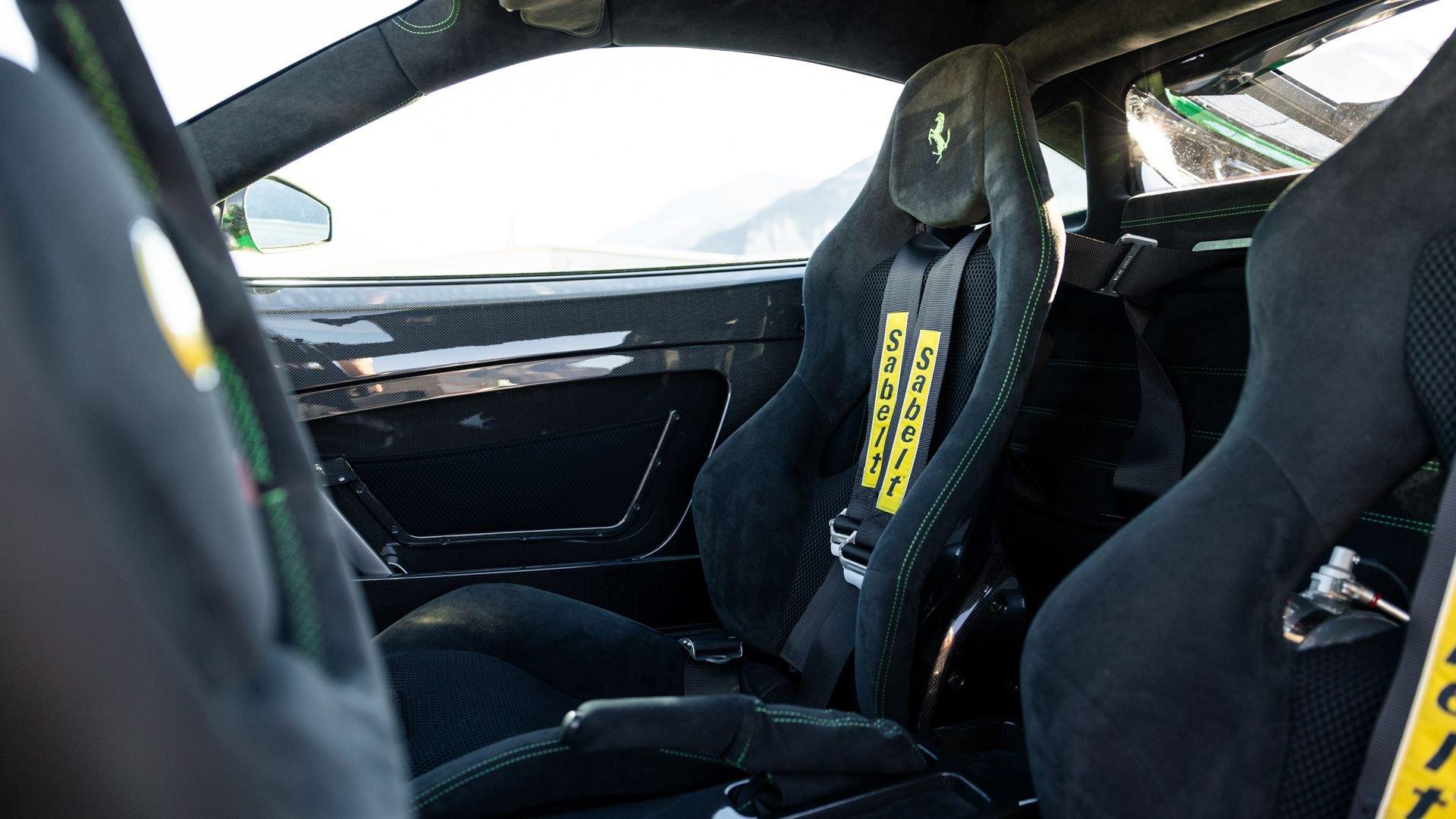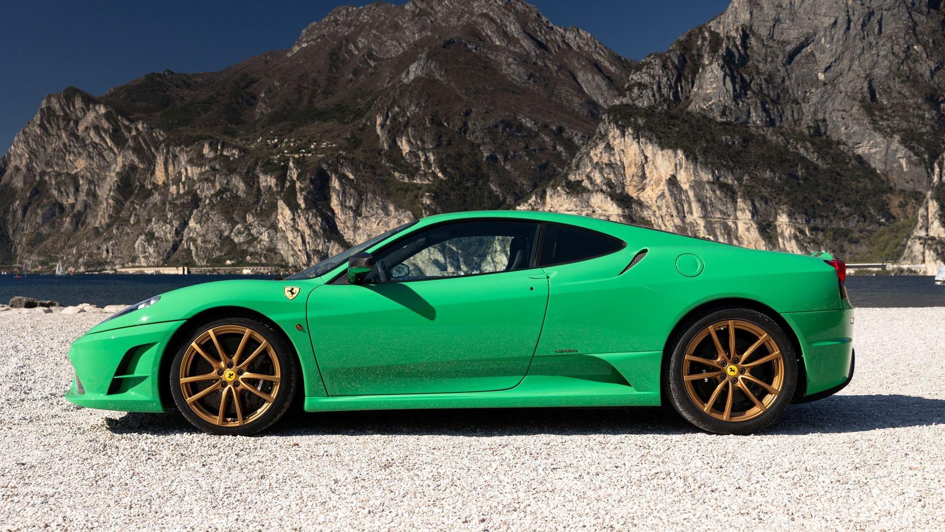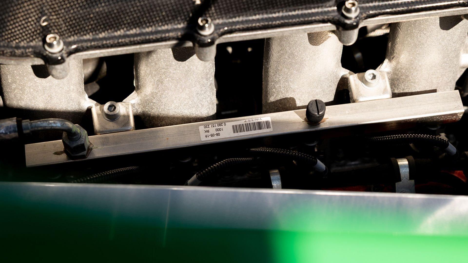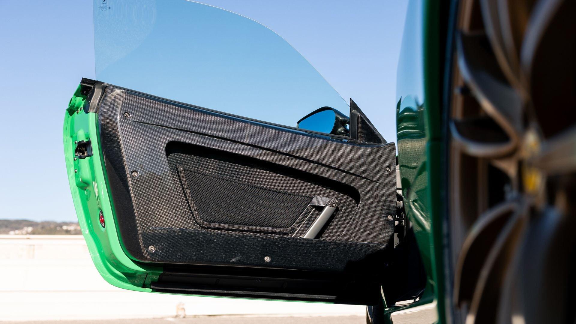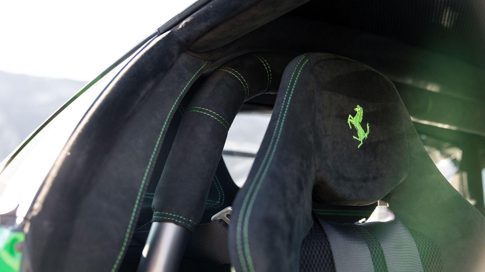 This stunning 430 Scuderia was ordered new through Ferrari dealer Lumani Krüger in Germany, with its original November 2007 order form specifying the car in Porsche Grün over Tessuto Nero. It is thought to be the only example of its type finished in this shade, specified by its paint sticker as Verde PPG (159331), supplied by PPG Industries. The vibrant paint was paired with equally striking Gold racing stripes running the length of the car and Gold-finished 19-inch alloy wheels for one of the most striking Scuderia specifications imaginable. The invoice also records a lavishly equipped example from new, including four-point harnesses, a rollover bar, carbon-fiber front and rear elements, carbon entry sills, a carbon LED steering wheel, an Alcantara-trimmed steering wheel and handbrake lever, Verde deviated stitching throughout, a satellite alarm, and a silver dedication plaque, inscribed “Raja & Andy.” In total, the car was ordered with over €41.000 in options-a considerable sum for the period, when the palette of personalization choices was far narrower than it is today.
