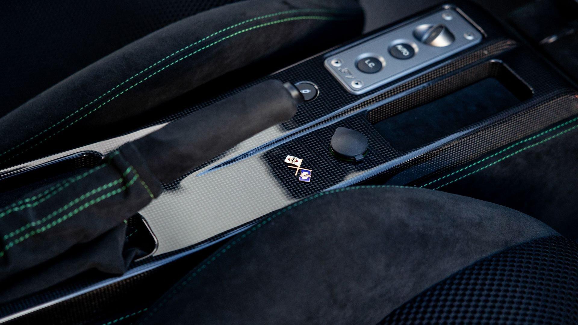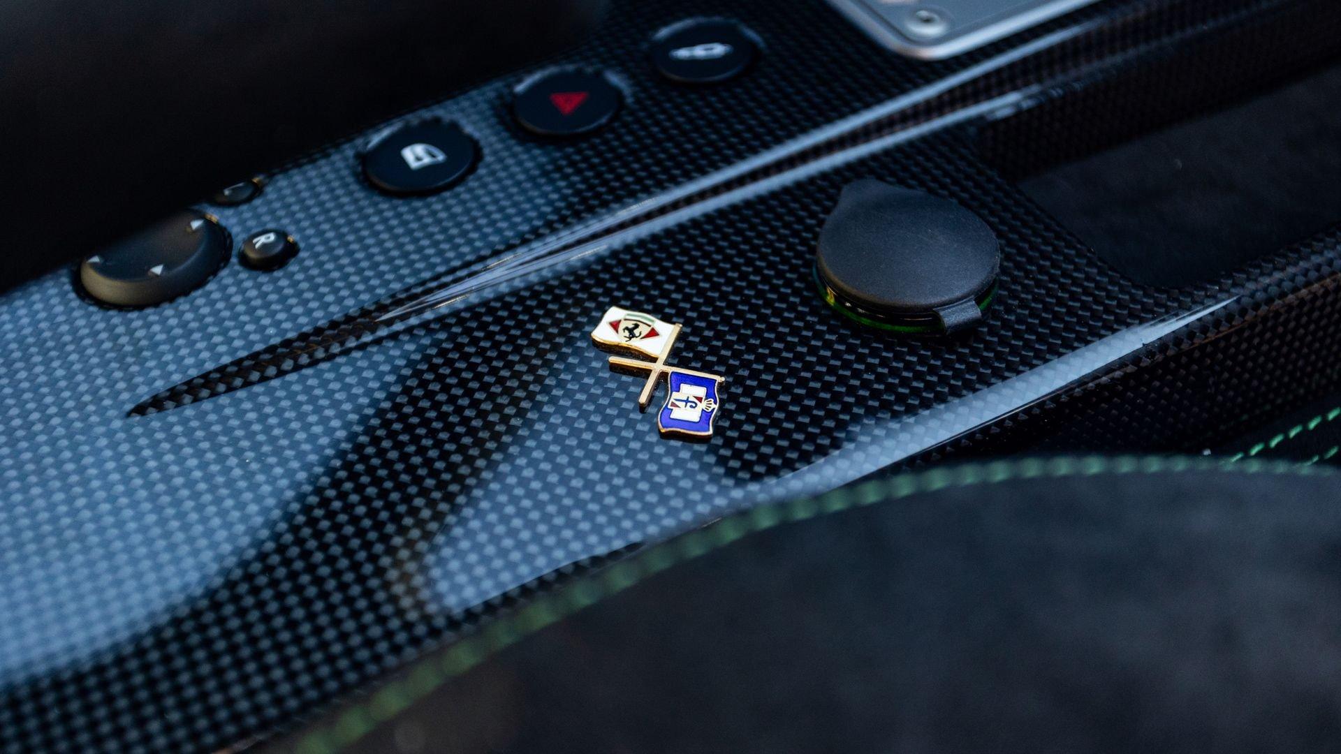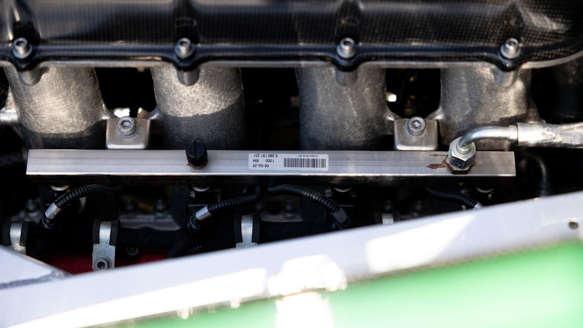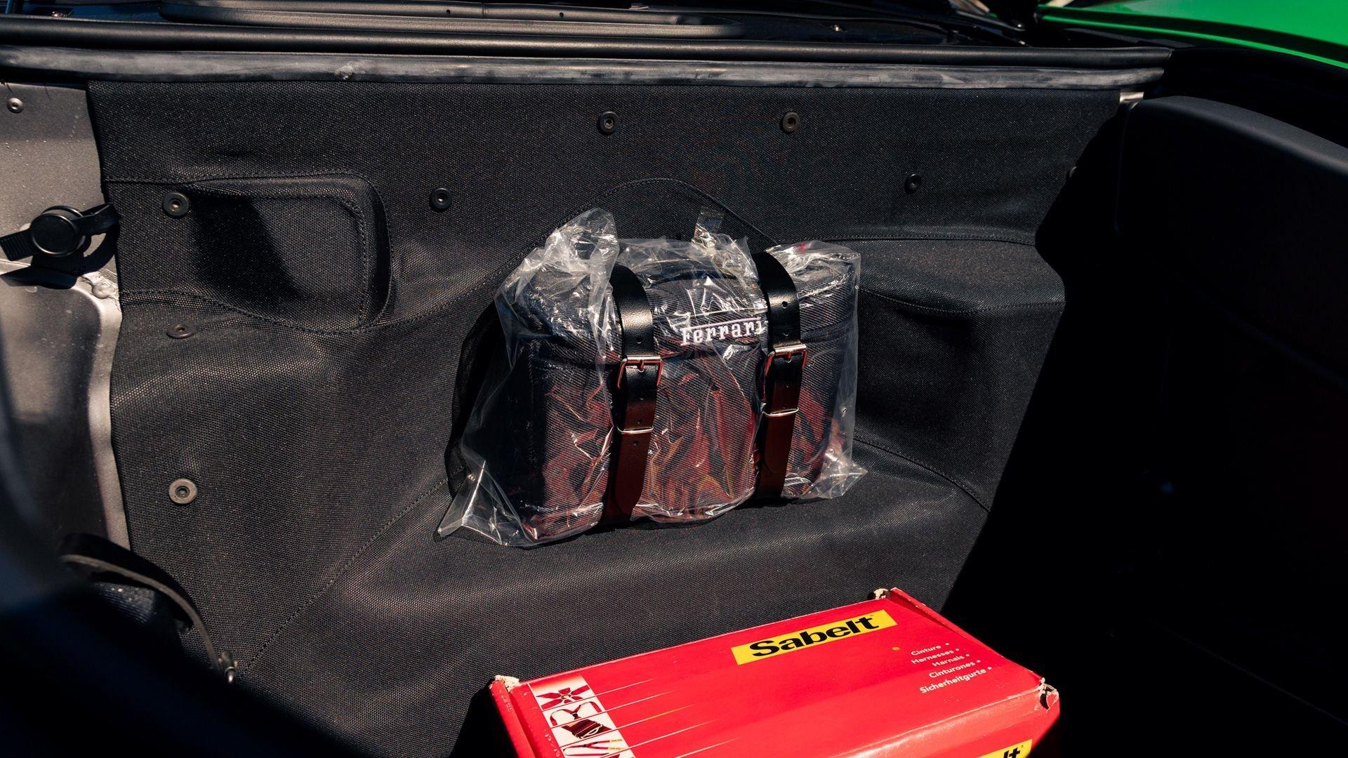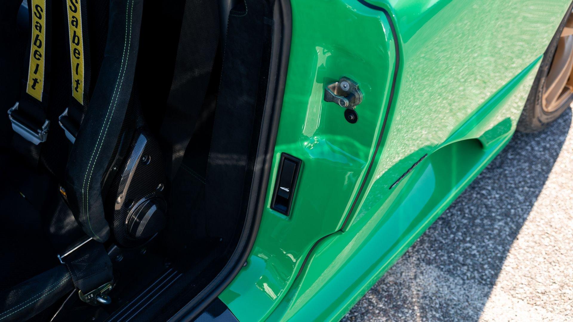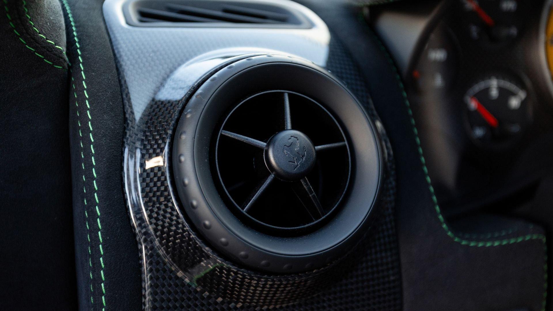 This stunning 430 Scuderia was ordered new through Ferrari dealer Lumani Krüger in Germany, with its original November 2007 order form specifying the car in Porsche Grün over Tessuto Nero. It is thought to be the only example of its type finished in this shade, specified by its paint sticker as Verde PPG (159331), supplied by PPG Industries. The vibrant paint was paired with equally striking Gold racing stripes running the length of the car and Gold-finished 19-inch alloy wheels for one of the most striking Scuderia specifications imaginable. The invoice also records a lavishly equipped example from new, including four-point harnesses, a rollover bar, carbon-fiber front and rear elements, carbon entry sills, a carbon LED steering wheel, an Alcantara-trimmed steering wheel and handbrake lever, Verde deviated stitching throughout, a satellite alarm, and a silver dedication plaque, inscribed “Raja & Andy.” In total, the car was ordered with over €41.000 in options-a considerable sum for the period, when the palette of personalization choices was far narrower than it is today.