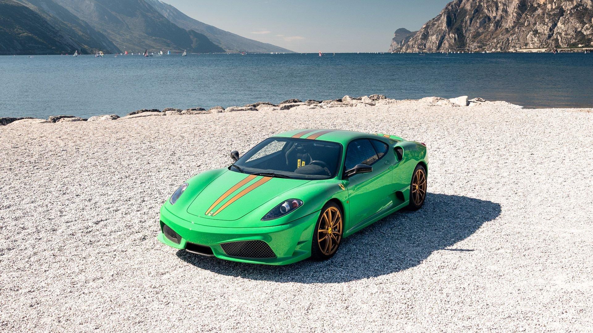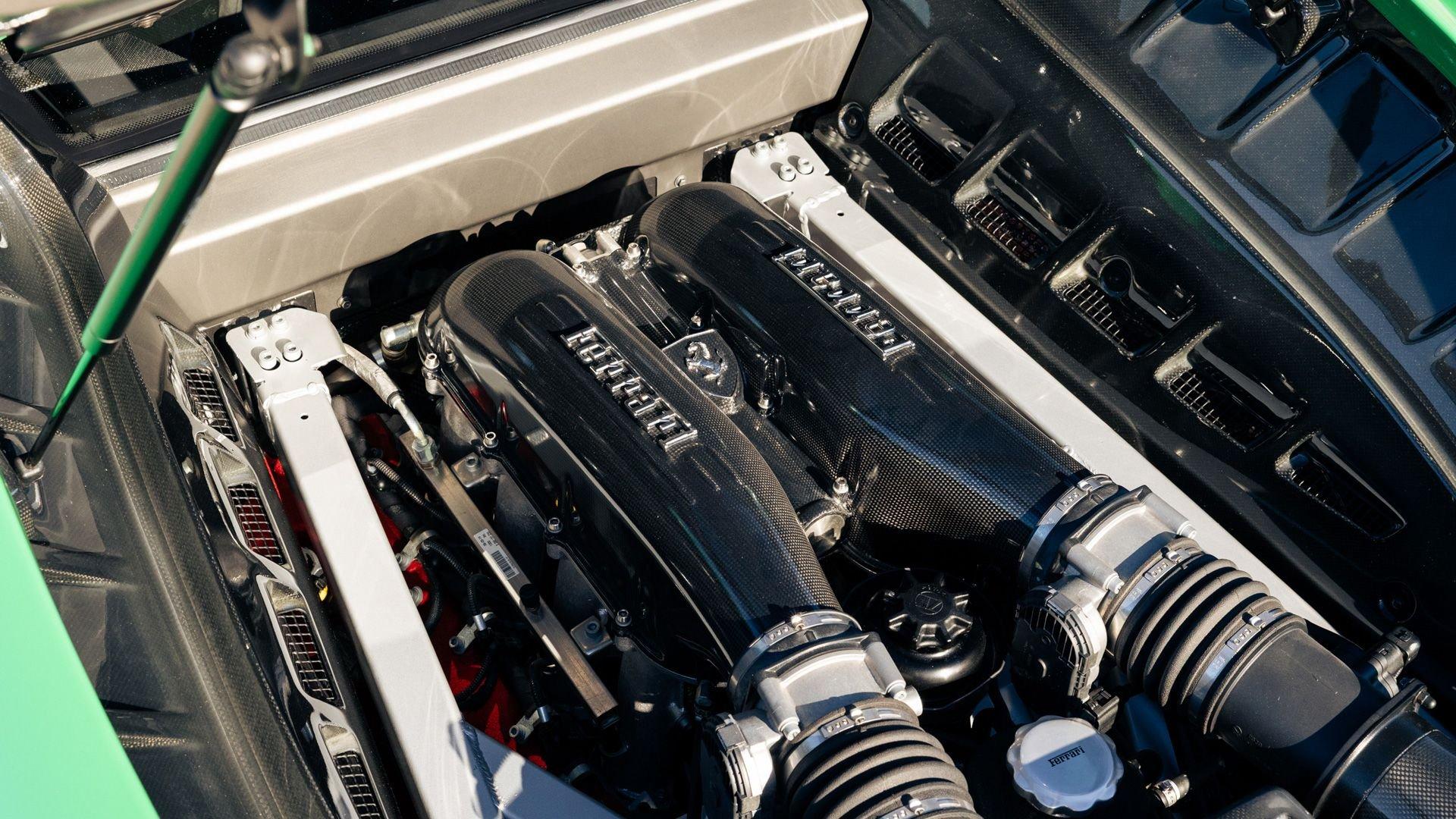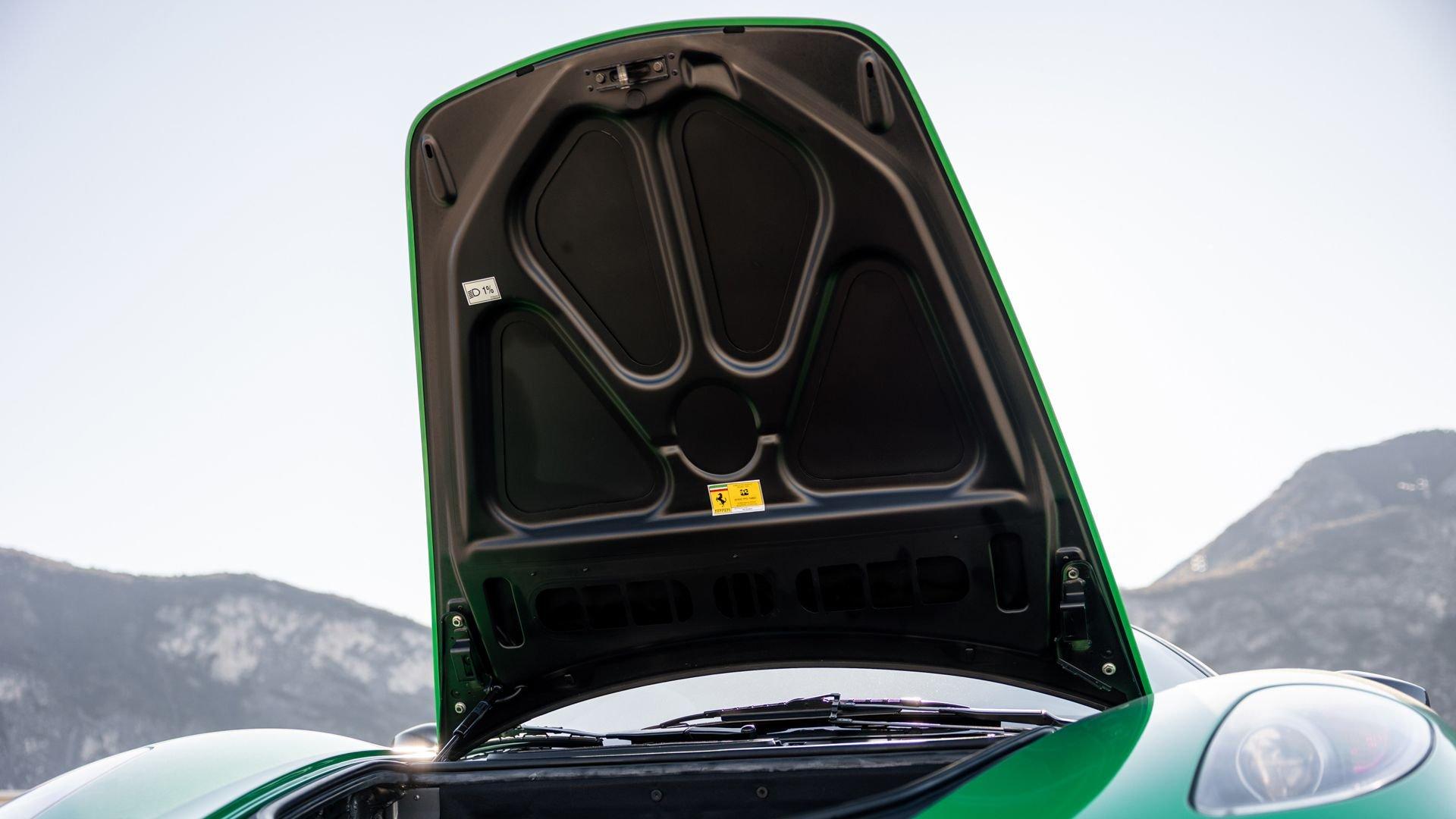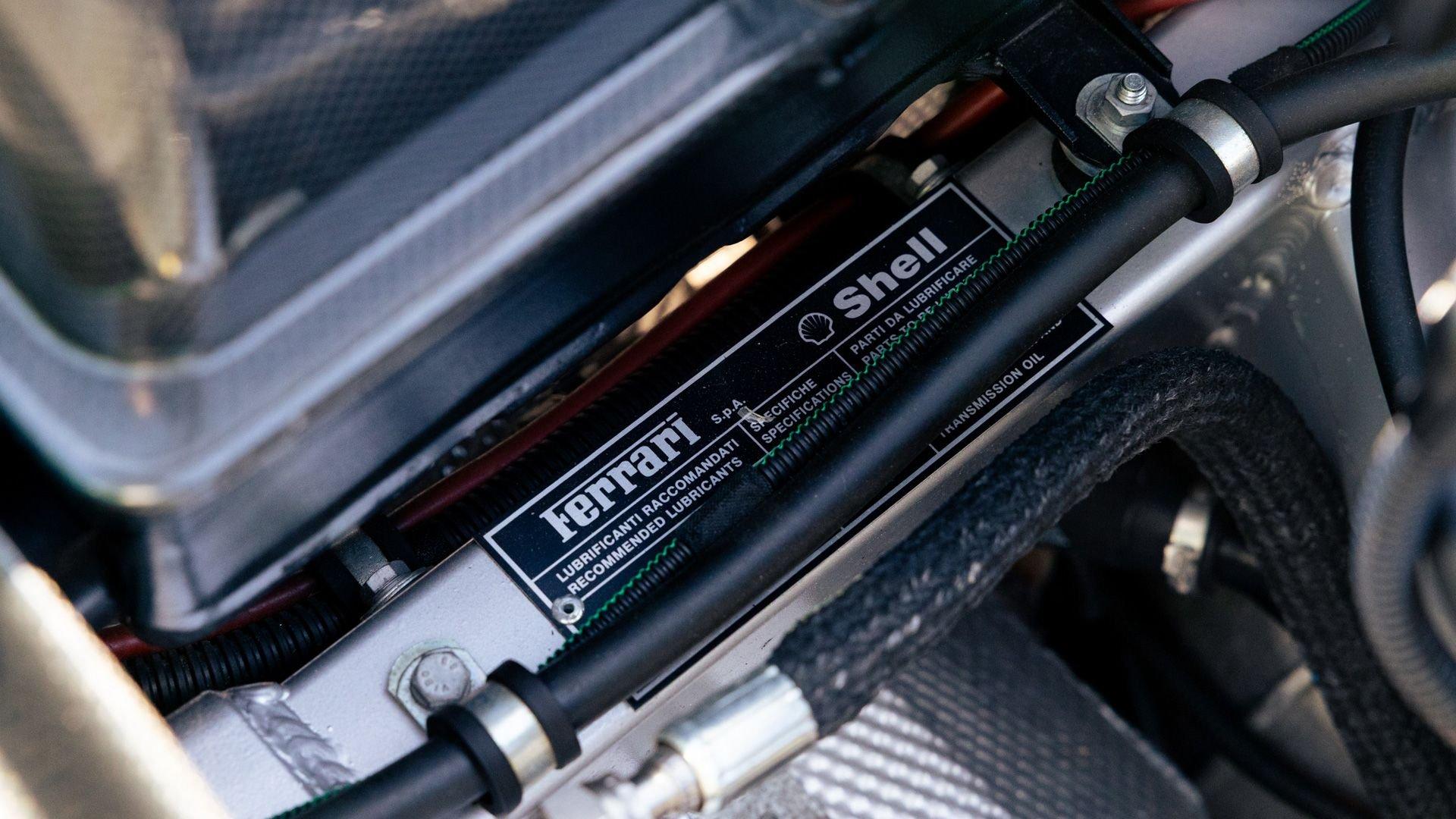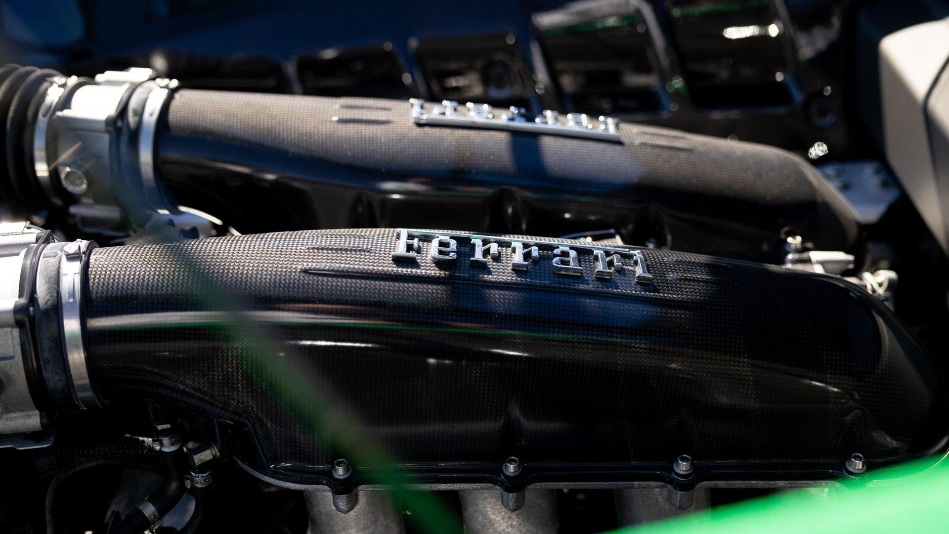 This stunning 430 Scuderia was ordered new through Ferrari dealer Lumani Krüger in Germany, with its original November 2007 order form specifying the car in Porsche Grün over Tessuto Nero. It is thought to be the only example of its type finished in this shade, specified by its paint sticker as Verde PPG (159331), supplied by PPG Industries. The vibrant paint was paired with equally striking Gold racing stripes running the length of the car and Gold-finished 19-inch alloy wheels for one of the most striking Scuderia specifications imaginable. The invoice also records a lavishly equipped example from new, including four-point harnesses, a rollover bar, carbon-fiber front and rear elements, carbon entry sills, a carbon LED steering wheel, an Alcantara-trimmed steering wheel and handbrake lever, Verde deviated stitching throughout, a satellite alarm, and a silver dedication plaque, inscribed “Raja & Andy.” In total, the car was ordered with over €41.000 in options-a considerable sum for the period, when the palette of personalization choices was far narrower than it is today.